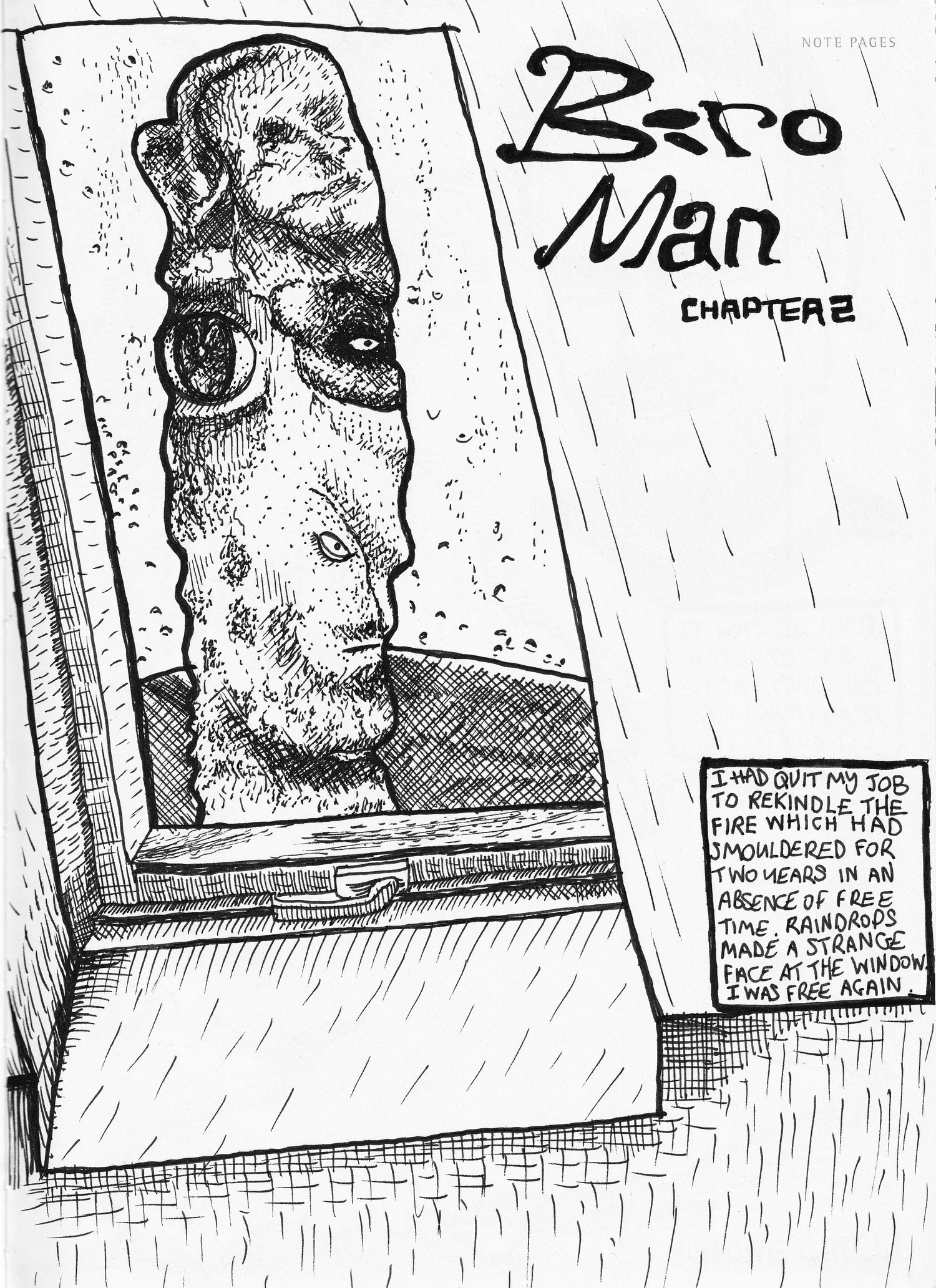 I had quit my job to rekindle the fire which had smoldered for two years in an absence of free time. Raindrops made a strange face at the window. I was free again.